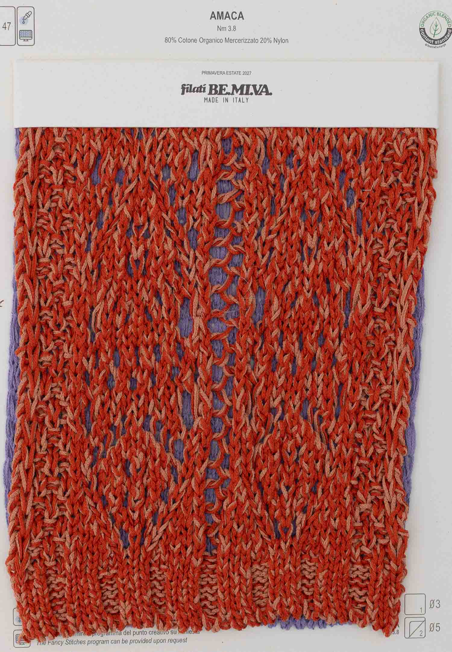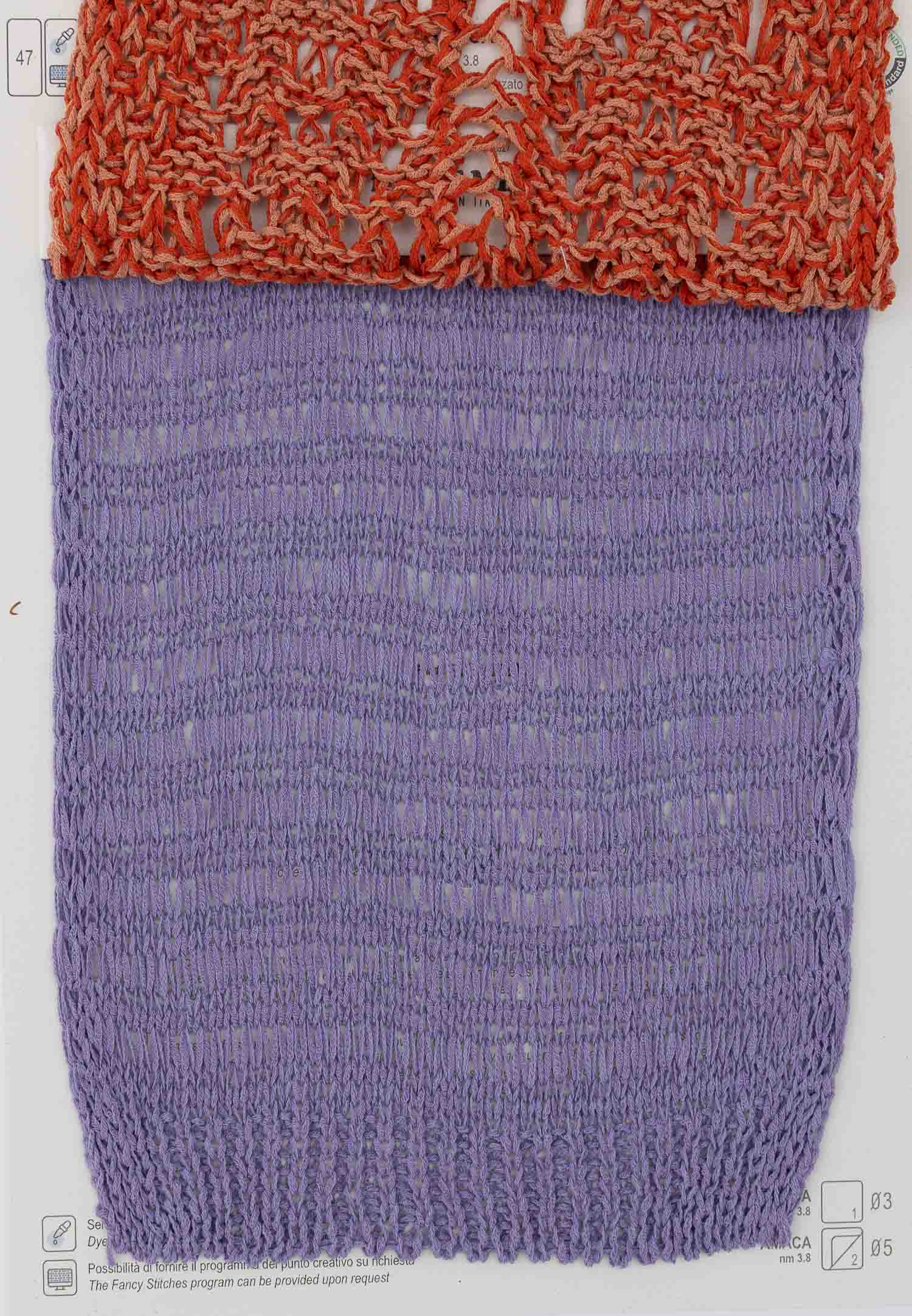 AMACA is a fresh and sustained plate. The innovation of this thread is the use of mercerized cotton in this special structure, which becomes sculpted and translucent like silk. The hand is dry and summery, for an innovative and three-dimensional knitwear also sporty but light. Suitable for raised knit stitches. To be used on gauges from 3 to 5.