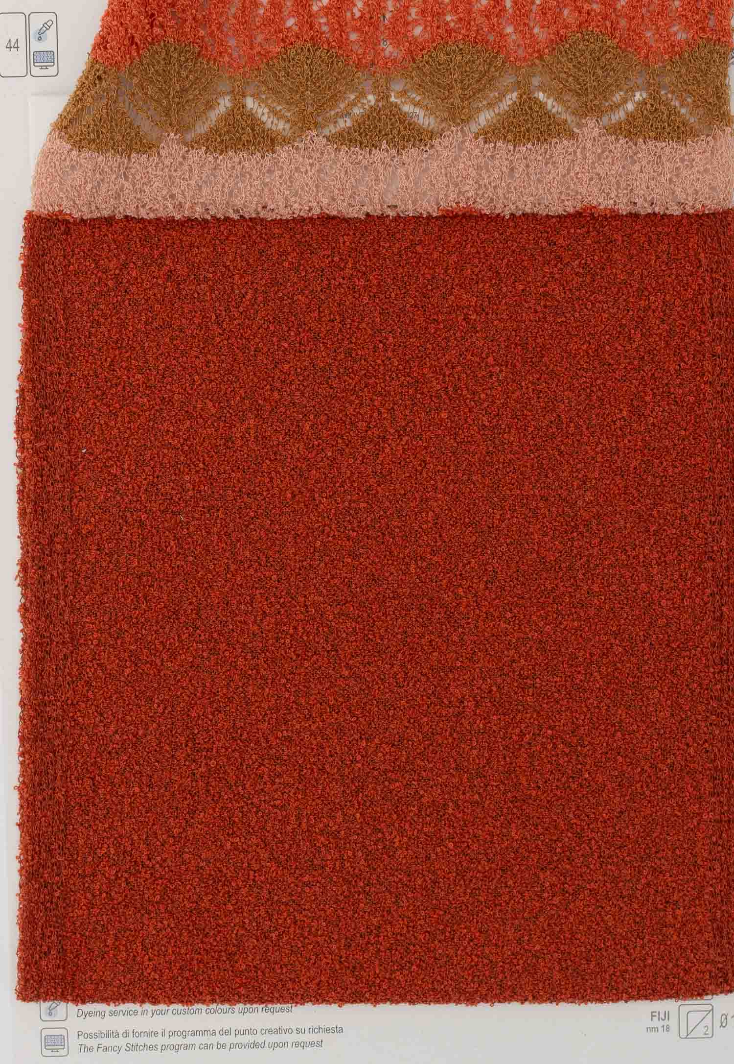 Fiji is a light and sophisticated bouclè in very fine cotton. The novelty is the creation of a classic padded yarn but for gauge 12-14. Peter is sporty but For this reason it is very versatile and usable in many knitting points. Elegant and it has a homogeneous effect of superficial micro-fantasy but with a soft and fresh hand. Available in both solid color and imaginative two-tone effects.
