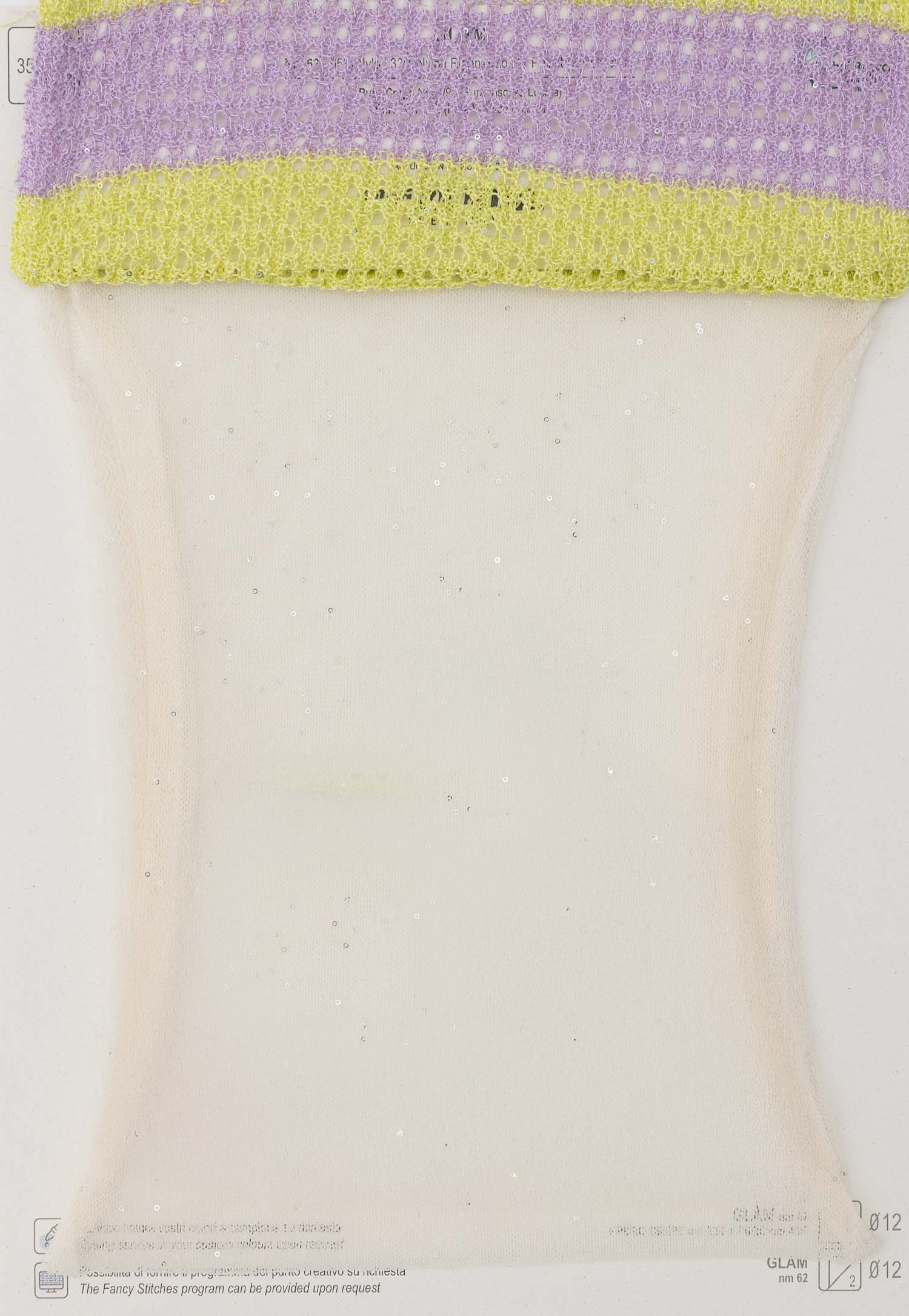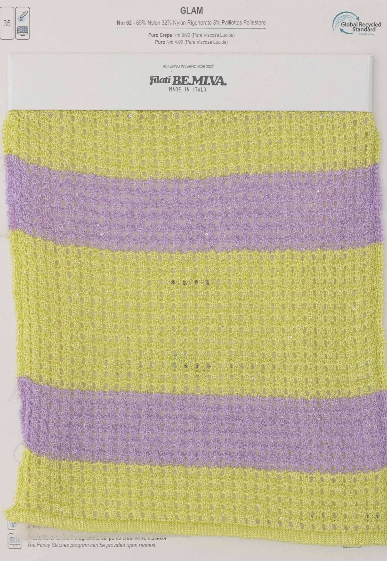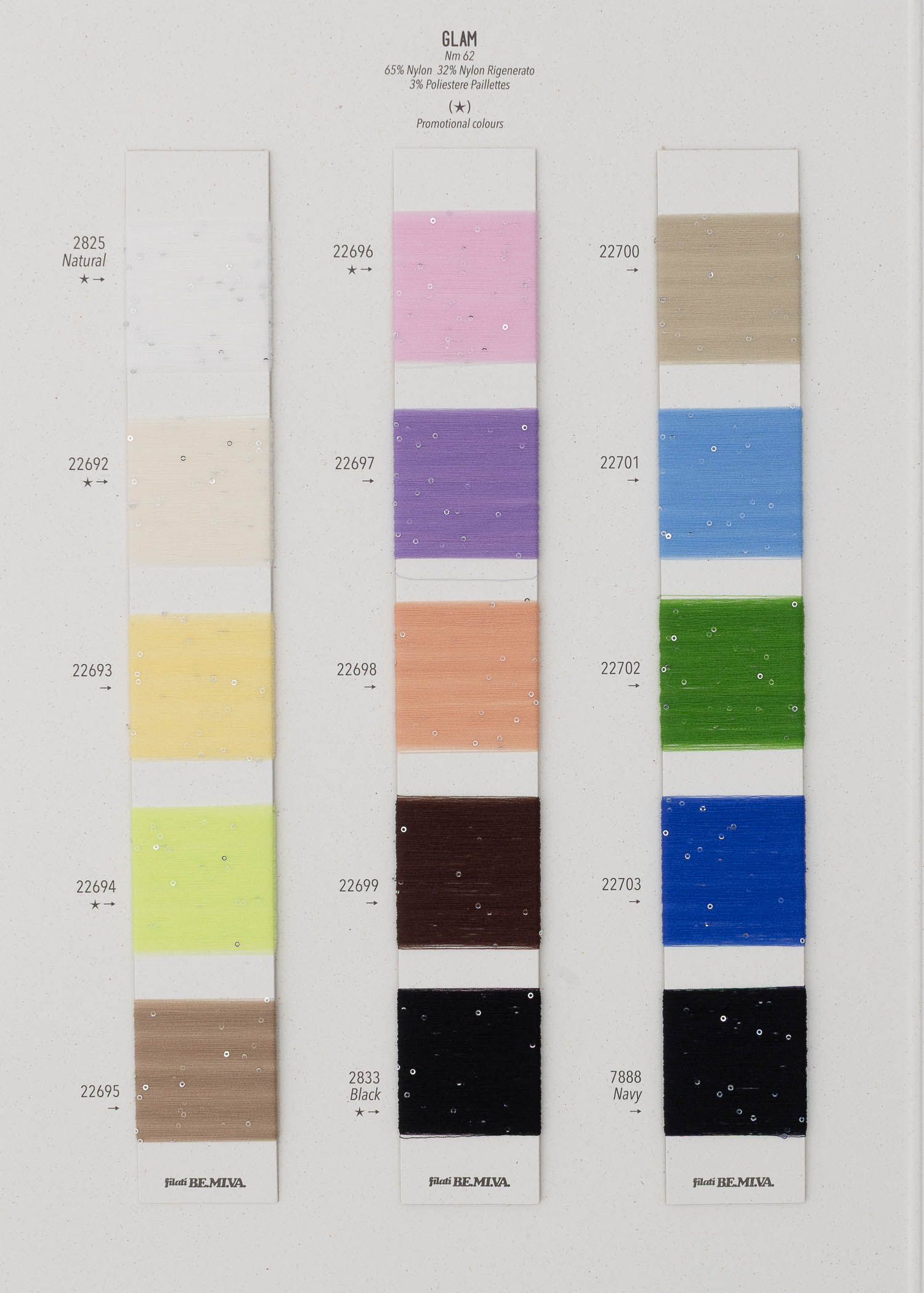 GLAM is a yarn embellished with micro sequins reminiscent of a starry sky. Ideal for refined and elegant knitwear. Its extreme lightness, despite the use of sequins, makes it a sophisticated and original yarn. This precious yarn is perfect when used as an accessory, mixed with other yarns from the collection, for elegant evening wear or lightweight summer outfits, always eco-friendly thanks to the regenerated nylon used in this yarn. Ideal gauge: 12.