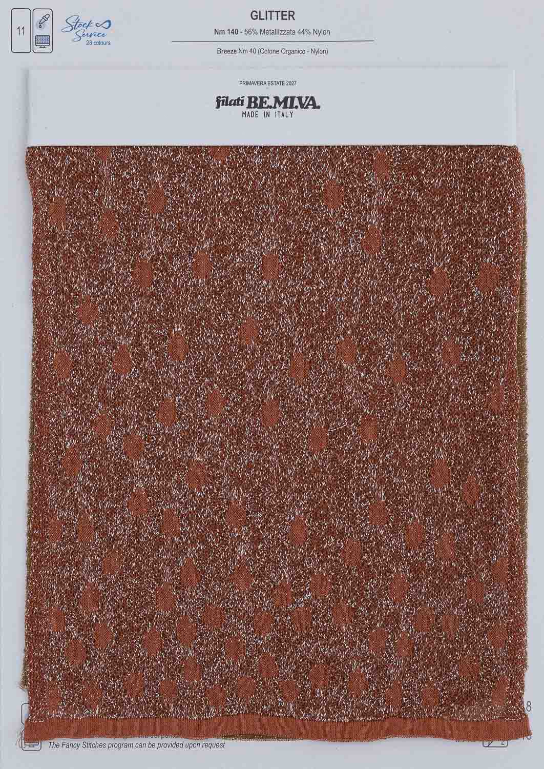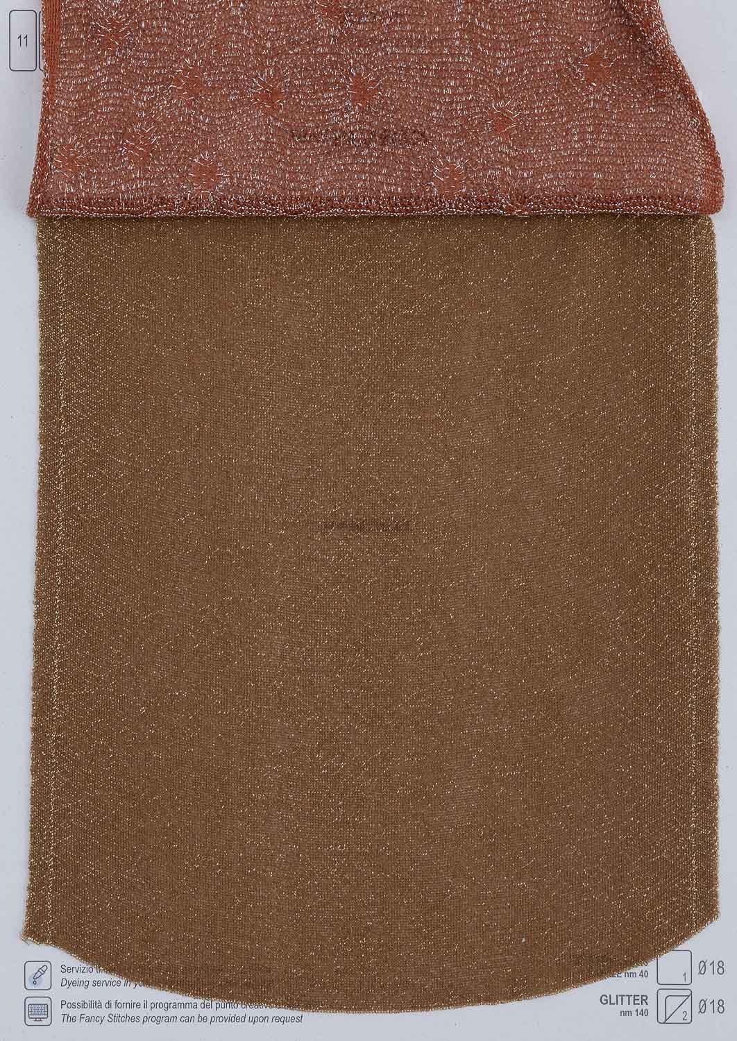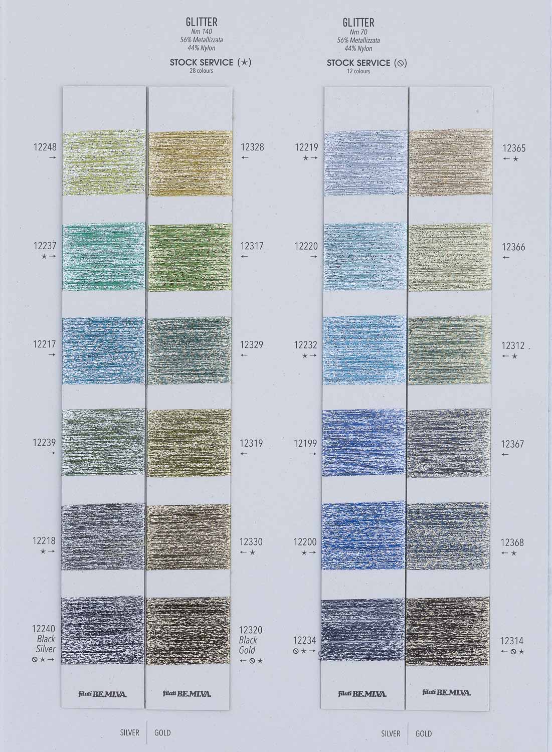 Possibili colori su richiesta clienti dalle 2 basi oro e argento (GLITTER) oppure dalla nuova elegantissima base (GLITTER UNITO) che grazie alla tintura speciale del lamè, crea toni pieni e profondi, dall'aspetto più sofisticato ed esclusivo.