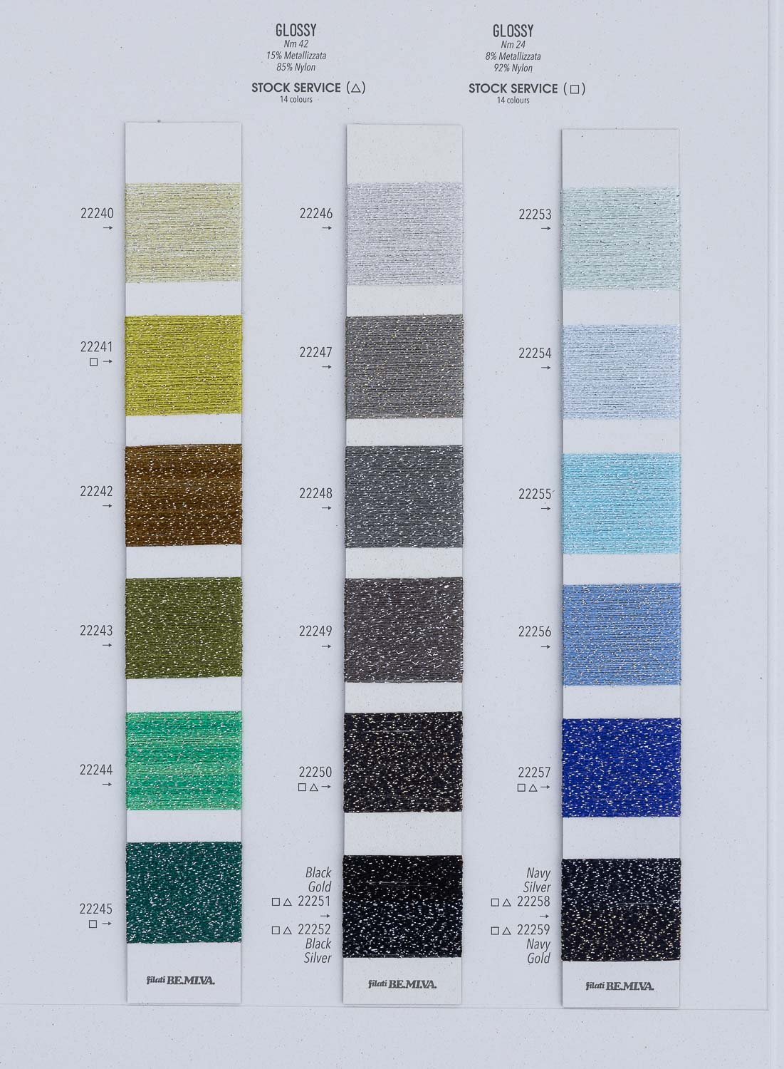 Lamè con gamma infinita di colori metallizzati e con ampia coloritura a stock service. Morbidissimo e ultrasottile ideato per capi elegantissimi e preziosi. Grazie alla possibilità di tintura di colori su richiesta clienti si presta anche ad essere abbinato a tutti i fili della collezione per impreziosire i capi grazie alla sua raffinata coloritura femminile argentata o dorata. Utilizzato anche in calzetteria per la sua estrema morbidezza a contatto con la pelle. Possibili colori su richiesta clienti dalle 2 basi oro e argento GLITTER Nm 70 e Nm 140 oppure GLOSSY Nm 24 e Nm 42.