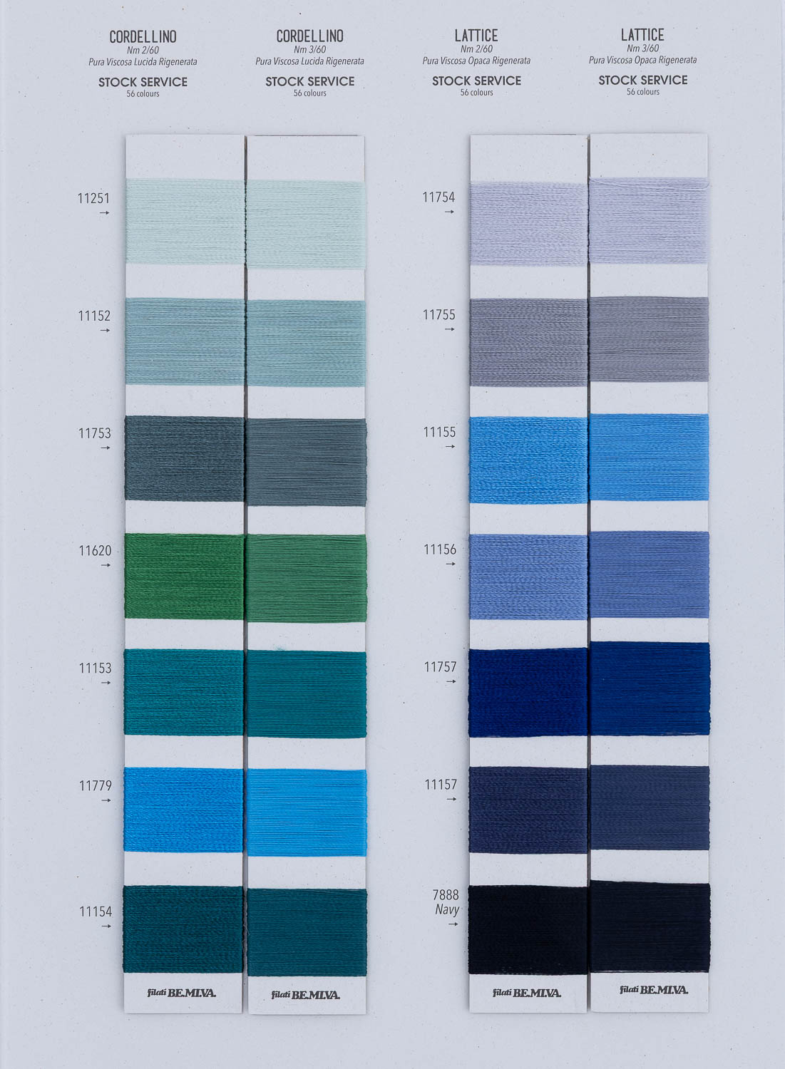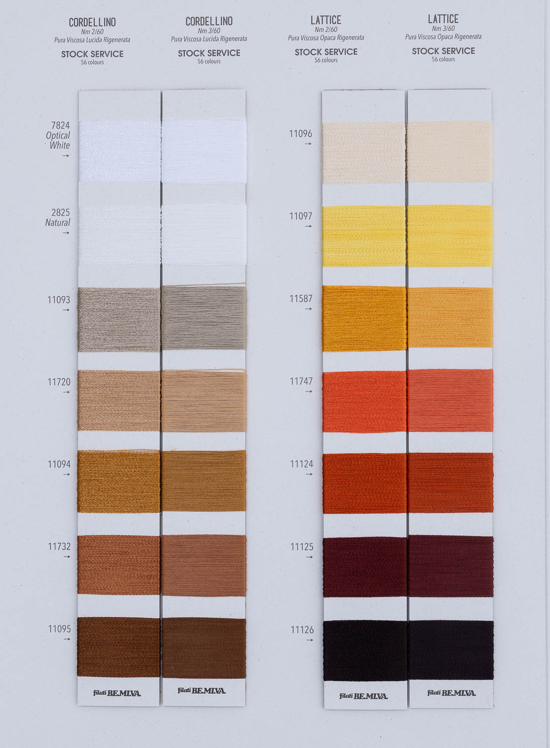 Tradizionali filati di Bemiva in viscosa bava continua effetto seta per capi fluidi, setosi ed eleganti per le finezze più sottili 12-14-16-18, dalla struttura tonda e sostenuta, ottima base ancora più apprezzata grazie alla nuova coloritura tutta in Stock Service e da una ampia cartella colori. Adatti anche come intervento assieme ad altri fili della collezione per conferire un aspetto lucido e femminile ai capi.