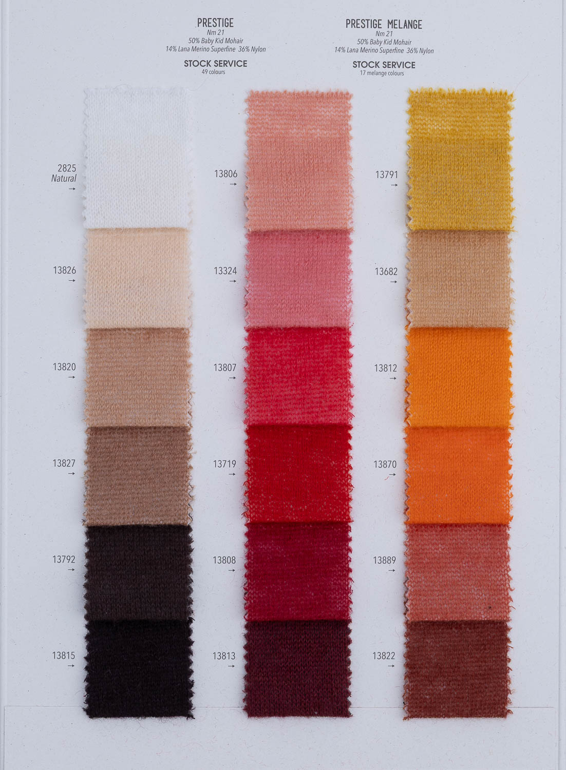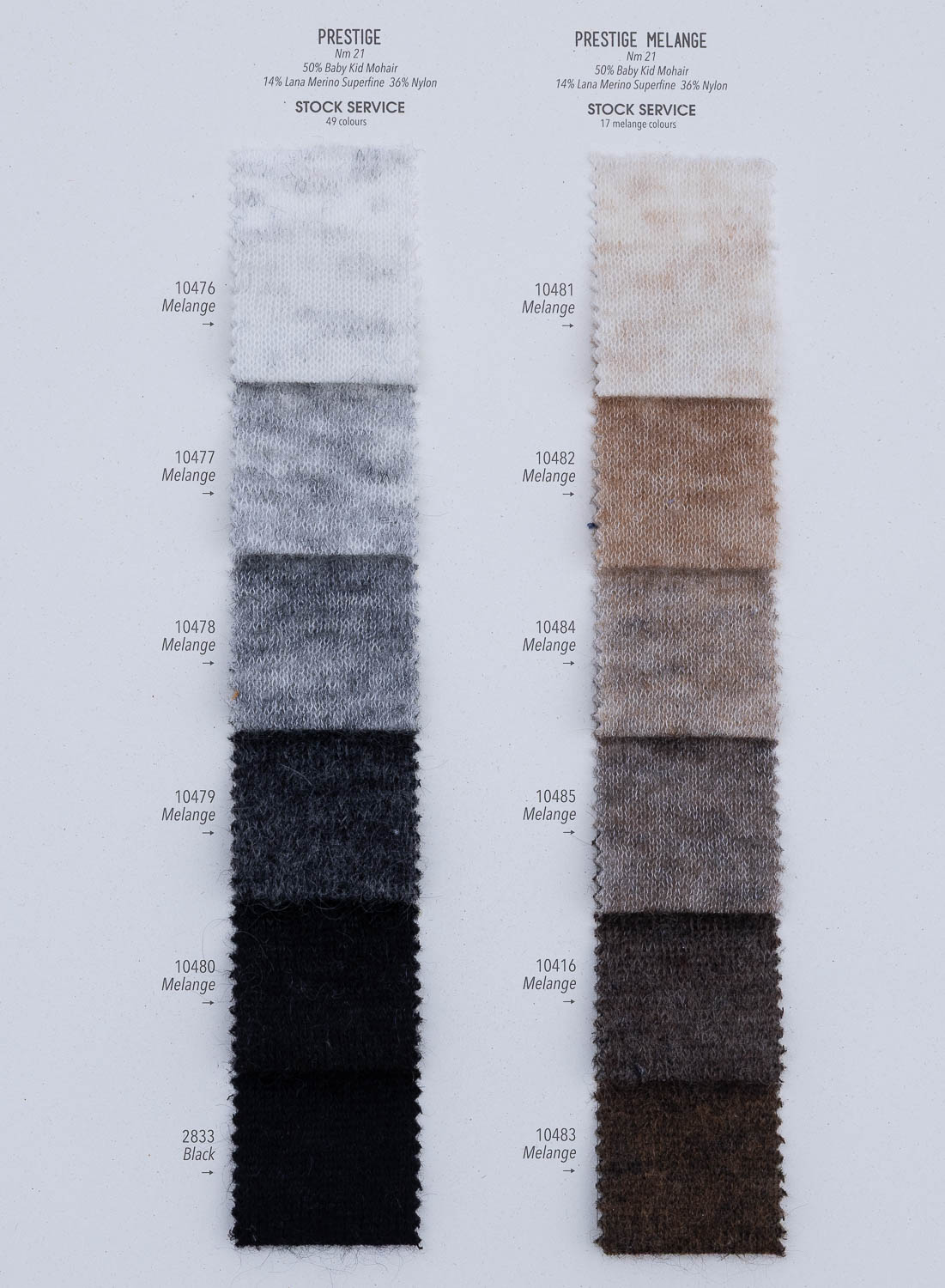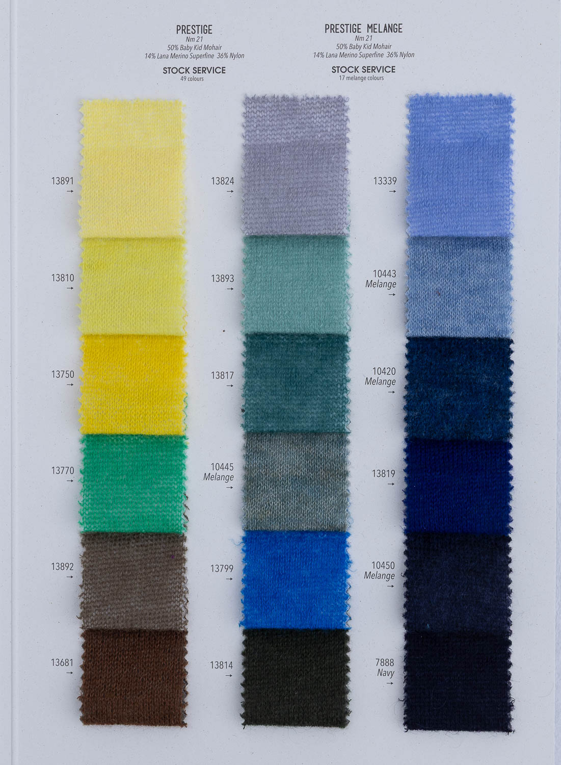 Dopo il successo del Prestige, versione dai colori uniti, abbiamo integrato l'articolo con la nuova offerta del Prestige Melange con i classici colori pretinti melange, tutti in Stock Service. Composti da pregiati Babykid e Merino Extrafine con filamenti tecnici per esaltarne il comfort e la leggerezza sono i filati della famiglia "Prestige" garzati e preziosi per l’alta gamma dove la voluminosità ed il comfort sono caratteristiche determinanti. Punti operati, effetti trina seguiti da trattamenti adeguati permettono la realizzazione di una maglieria soffice come una nuvola senza peso. Prestige, ancora più apprezzato per la cartella di colori uniti a Stock Service, può anche essere personalizzato con colori a campione per completare le esigenze delle collezioni dei nostri clienti.