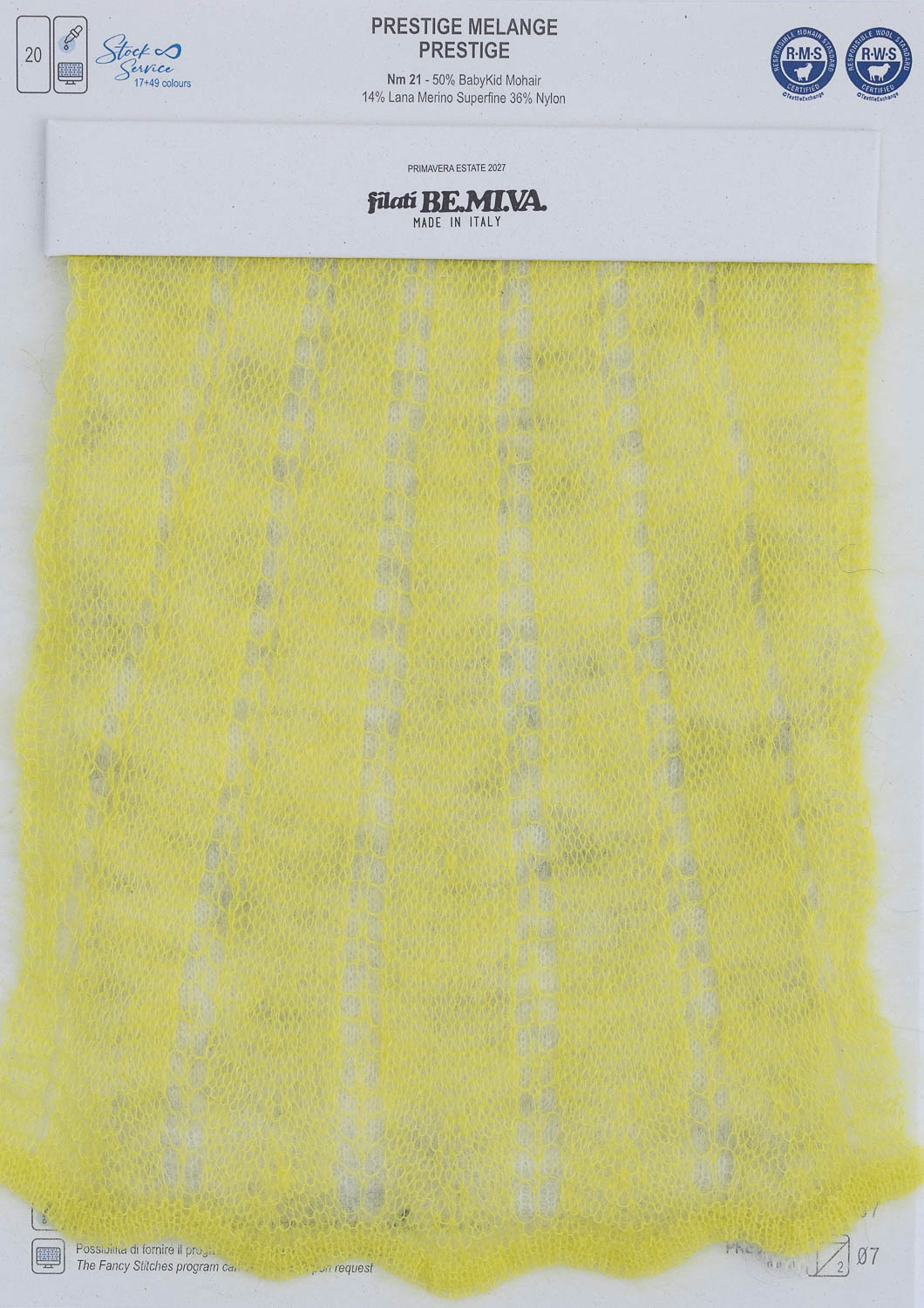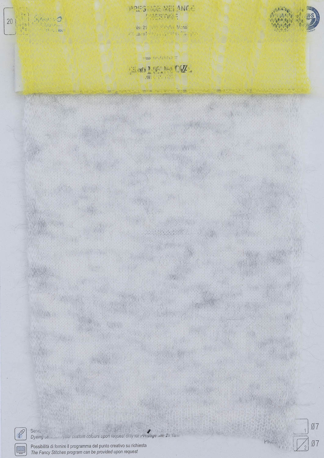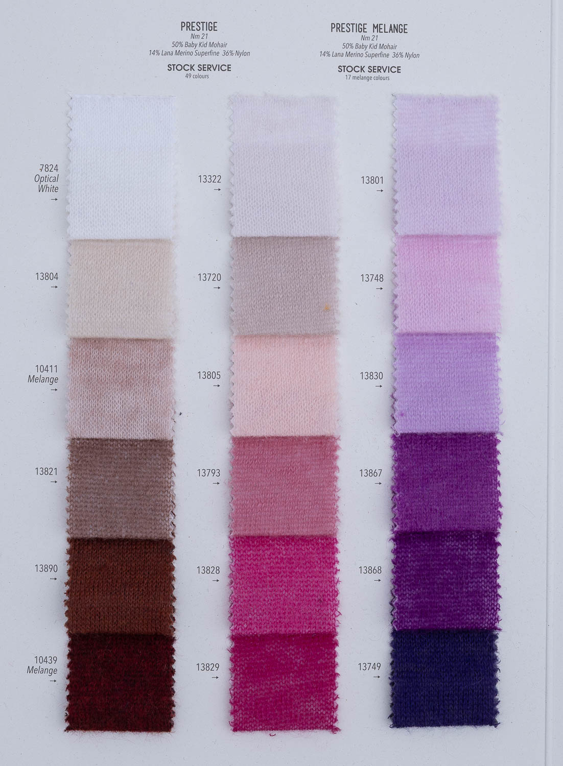 Dopo il successo del Prestige, versione dai colori uniti, abbiamo integrato l'articolo con la nuova offerta del Prestige Melange con i classici colori pretinti melange, tutti in Stock Service. Composti da pregiati Babykid e Merino Extrafine con filamenti tecnici per esaltarne il comfort e la leggerezza sono i filati della famiglia "Prestige" garzati e preziosi per l’alta gamma dove la voluminosità ed il comfort sono caratteristiche determinanti. Punti operati, effetti trina seguiti da trattamenti adeguati permettono la realizzazione di una maglieria soffice come una nuvola senza peso. Prestige, ancora più apprezzato per la cartella di colori uniti a Stock Service, può anche essere personalizzato con colori a campione per completare le esigenze delle collezioni dei nostri clienti.